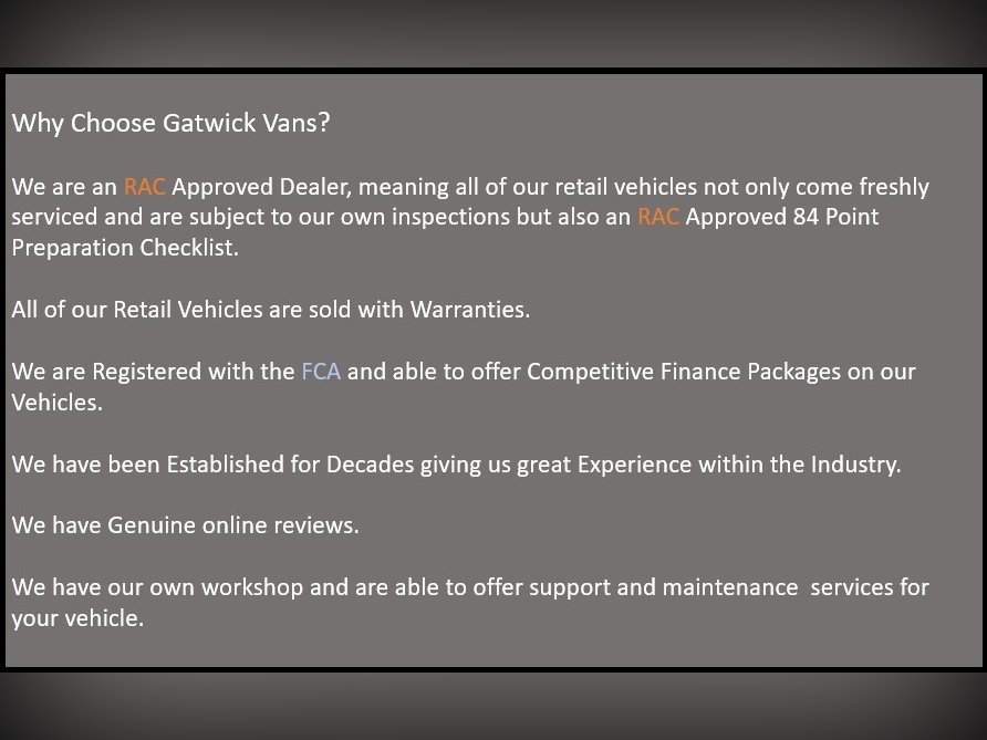 This Van can be offered on various finance packages to suit your needs, a average HP cost on this vehicle with a £2000 deposit would be £55 per week. It is sold with a 6 month RAC Platinum Warranty and has been subject to Comprehensive RAC approved Standards 84 point Check. It has just had a large service carried out in our workshop including new tryes al round. The Van Comes with Parking sensors, Security locks, Air con, 3 seats, side loading door, Electric windows & Mirrors, a full bulk head, roof rack, it is also ply lined. The van itself is extremely nice and clean both inside and out, the bodywork is in good order. The interior is very nice and clean and everything works as it should, all brakes, suspension and tyres are good also. It comes with a 6 month RAC Platinum Warranty included in the price. Fully HPI checked. It starts and drives very well. If you are viewing on a phone please visit our website, www.gatwickvans.co.uk for more pictures. At Gatwick Vans we appreciate how hard it can be when buying a used van, we try and take care when selecting all of our vans, more often rejecting more than we purchase. Due to the experience we have, we have gained a knowledge that helps us know what to look for across the different models. Also before any of our vans go up for sale we have a mechanic check each vehicle over. We also carry out a HPI Check on all of our vehicles. £12495 with NO VAT. Every effort has been made to ensure the accuracy of the information above. However, errors may occur. Please check with us about items which may affect your decision to purchase. Part Exchange Possible. Any Inspection welcome. Opening times: Mon-Sat 8-4. Find us at RDC GATWICK, Derrinabrin Farm, Norwood Hill Rd, RH60EB (10 Mins from Gatwick Airport) Credit Debit cards taken. Finance Available, Please Call on 07949720148 or Call free on 08001588061